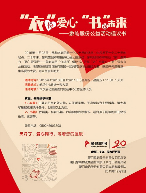 11月20日,集團(tuán)工會、團(tuán)委、志愿者總隊聯(lián)合發(fā)出《象嶼集團(tuán)11.28“公益日”倡議書》,倡導(dǎo)從今年起,將每年的11.28即集團(tuán)成立日,設(shè)立為“象嶼公益日”,鼓勵全體員工在這一天走出工作崗位,走進(jìn)社會去做力所能及的志愿善舉。公益源于“八方助力”,美在“百花齊放”。自倡議書發(fā)布以來,集團(tuán)首次“公益日”活動受到各公司熱烈支持和積極響應(yīng)。