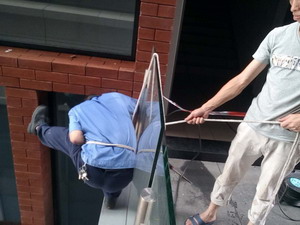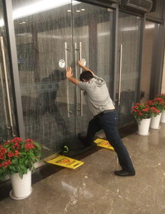 王志富是臺(tái)風(fēng)登陸當(dāng)晚象嶼高尚物業(yè)公司留下值守的54位員工中的一個(gè),他負(fù)責(zé)國(guó)際航運(yùn)中心D棟的安全。D棟處于風(fēng)口位置。凌晨2點(diǎn)多,風(fēng)大作,雨加急,那聲勢(shì)猶如排山倒海,讓這位魁梧的大漢也是心驚。眼看防汛沙袋做的大門(mén)加固也無(wú)法阻擋風(fēng)雨的侵入,他不顧只身一人,奮力頂住玻璃大門(mén)?!耙坏┯晁嗳氪筇?,流入電梯井,后果不堪設(shè)想!”聞?dòng)嵹s來(lái)增援的4位值守人員也都撲上來(lái)用力頂住大門(mén),五人使足了勁,一個(gè)多小時(shí)后,風(fēng)力減弱,他們以堅(jiān)定的意志戰(zhàn)勝了狂暴的臺(tái)風(fēng),玻璃門(mén)沒(méi)有倒下,D棟安全了!