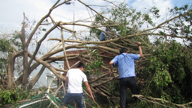 “莫蘭蒂”的威力是巨大的,在其登陸前兩個(gè)小時(shí),港區(qū)電壓開(kāi)始呈現(xiàn)不穩(wěn)定狀態(tài),時(shí)亮?xí)r暗。蘇展是值守港區(qū)的電工,為了讓安置在避險(xiǎn)中心的數(shù)千船員有明亮的燈光,他不顧個(gè)人安危,冒著狂風(fēng)暴雨前往配電室進(jìn)行檢查。路上被風(fēng)刮起的鐵板將衣服劃破,所幸沒(méi)有受傷?!半娎|溝進(jìn)水導(dǎo)致了短路,港區(qū)全部跳閘停電,路燈燈頭也被摧毀?!碧K展有些無(wú)奈,雖然如此,他仍堅(jiān)守在配電室直至風(fēng)雨漸收,確保了配電室設(shè)備沒(méi)有受到破壞。