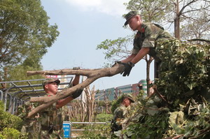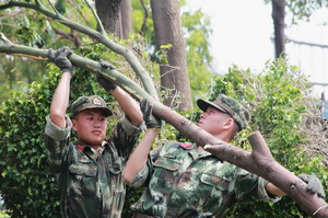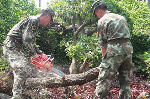 9月19日,子弟兵來了。這群已經(jīng)為廈門奮戰(zhàn)四天四夜的親人,來到廈門國際航運中心,攜手象嶼人,一同清運兩處景觀公園的斷樹殘枝。