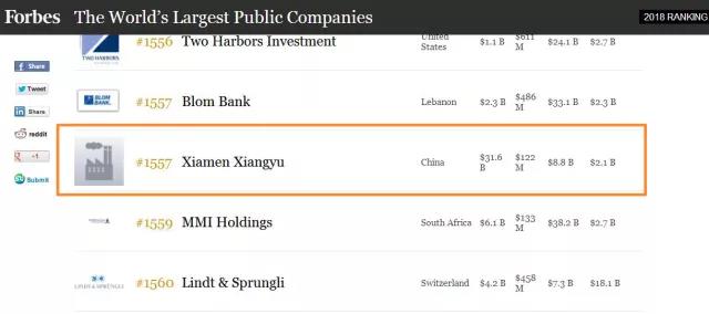 今日,美國《福布斯》雜志發(fā)布2018年“全球上市公司2000強”排行榜(Forbes Global 2000),廈門象嶼(600057)排名1557名,較去年躍升228位。