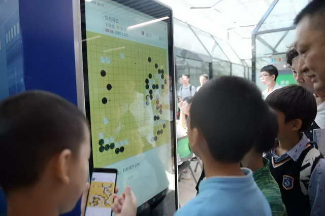 圍在一旁的圍棋小愛好者們摩拳擦掌,輪流在一旁圍棋互動屏熱身,準(zhǔn)備進(jìn)場挑戰(zhàn)“棋智”!現(xiàn)場的圍棋圖書和人工智能圍棋閱覽交流區(qū)也熱鬧非凡。