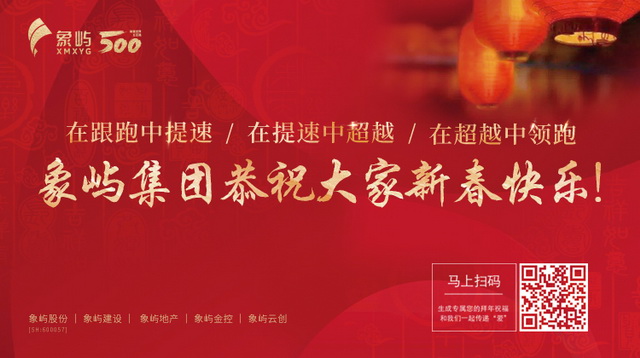 流轉(zhuǎn)的光陰,見證著奮斗者不曾停息的腳步;騰飛的中國,激蕩著創(chuàng)新者永立時代的潮頭。在新春佳節(jié)來臨之際,我們謹(jǐn)代表集團各套班子向奮斗在海內(nèi)外各個工作崗位上的象嶼人、所有關(guān)心和支持象嶼事業(yè)發(fā)展的各級領(lǐng)導(dǎo)和社會各界朋友拜年,并通過你們向你們的家人致以節(jié)日的美好祝福!祝大家新春愉快!