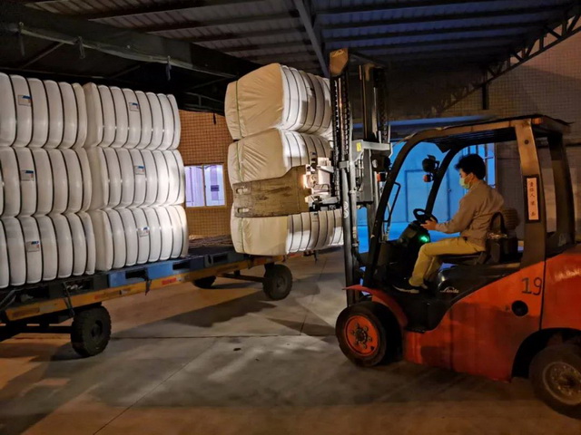 這一段時(shí)間里,象嶼興泓公司上下一派熱火朝天的工作景象,銷售部門口罩原料訂貨電話響個(gè)不停;生產(chǎn)線上,共三條ES衛(wèi)材生產(chǎn)設(shè)備24小時(shí)運(yùn)轉(zhuǎn),投料、紡絲、卷繞、延伸、烘干、切斷……一道道工序嚴(yán)格把關(guān),包包做工優(yōu)質(zhì)的ES衛(wèi)材新鮮出爐;倉庫前,各工種緊密協(xié)同,快速有序地將產(chǎn)品打包裝車,源源不斷發(fā)往下游口罩生產(chǎn)企業(yè)。