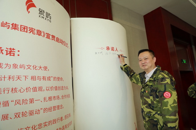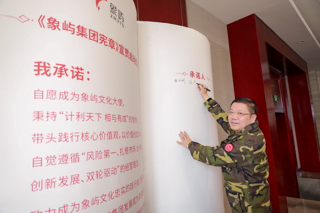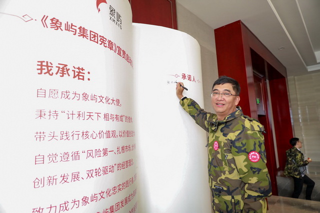在《象嶼集團(tuán)憲章》宣貫啟動(dòng)儀式上,121名象嶼文化大使鄭重承諾:“我自愿成為象嶼文化大使,秉持‘計(jì)利天下 相與有成’的使命,帶頭踐行核心價(jià)值觀,以價(jià)值創(chuàng)造為本,自覺遵循‘風(fēng)險(xiǎn)第一、扎根市場、合作共贏、創(chuàng)新發(fā)展、雙輪驅(qū)動(dòng)’的經(jīng)營理念,致力成為象嶼文化忠實(shí)的踐行者、感召者、傳播者,為把象嶼集團(tuán)發(fā)展成為具有全球競爭力、以供應(yīng)鏈為核心的綜合性投資控股集團(tuán)而努力奮斗!”
