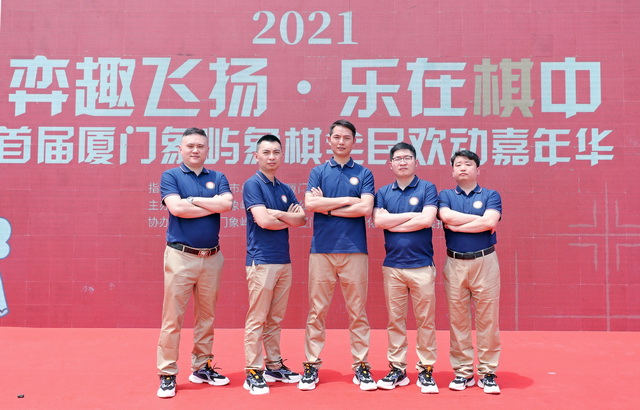 ▲廈門(mén)象嶼象棋隊(duì)隊(duì)員象棋特級(jí)大師鄭一泓(中)、張學(xué)潮(左二)、郝繼超(左一)和象棋大師陳泓盛(右二)、苗利明(右一),即將代表廈門(mén)出征。