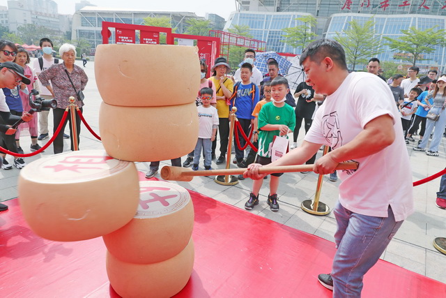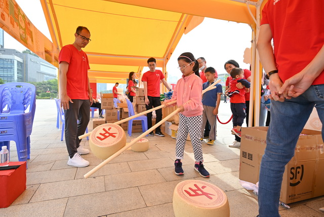 在象棋大擺錘游戲區(qū)前,只要敲擊掉5顆大象棋中間的1顆,并保證其他棋子不倒,便能闖關(guān)成功。只見(jiàn)大小朋友們輪番上陣,掄起大擺錘使勁敲擊,有人使出洪荒之力,不慎將象棋全部打翻;有人精準(zhǔn)打擊卻用力不足,象棋巋然不動(dòng)……幾回合下來(lái),大家終于掌握了制勝法寶——精準(zhǔn)施力。歡笑聲在各大游戲互動(dòng)區(qū)洋溢,不少闖關(guān)成功的市民,手捧精美禮品,滿(mǎn)載而歸。