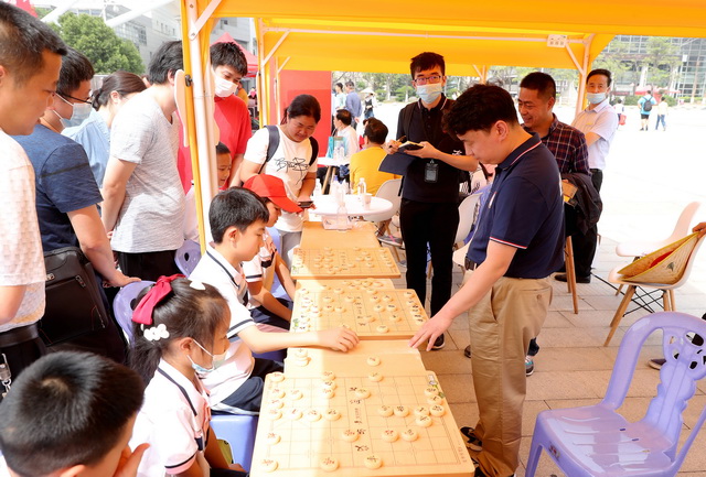 象棋大擺錘、象棋轉(zhuǎn)移挑戰(zhàn)、默背象棋挑戰(zhàn)、滑棋大挑戰(zhàn)、笑口常開(kāi)等以象棋為主題的游戲互動(dòng)區(qū),人頭攢動(dòng)、熱鬧非凡。