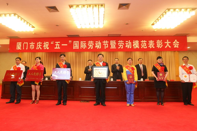 4月30日下午,廈門市慶?!拔逡弧眹H勞動節(jié)暨勞動模范表彰大會在人民會堂舉行。王龍雛董事長從廈門市委書記王蒙徽手中接過了全國“五一勞動獎狀”,同時(shí)獲得大會表彰的還有榮獲“廈門市勞動模范”稱號的集團(tuán)公司員工吳捷。