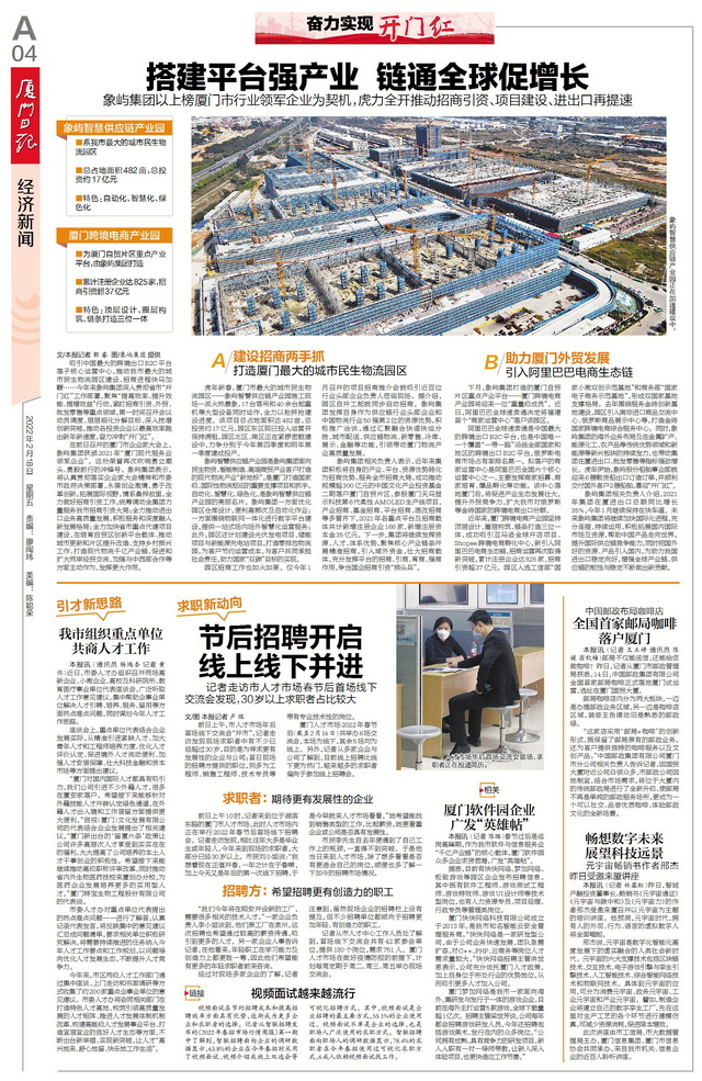 近年來,廈門跨境電商產(chǎn)業(yè)園堅持頂層設(shè)計、圈層構(gòu)筑、鏈條打造三位一體,成功吸引亞馬遜全球開店項目、Shopee跨境電商孵化中心,新引入阿里巴巴電商生態(tài)鏈,招商運營再次取得新突破,累計注冊企業(yè)達825家,招商引資超37億元。園區(qū)入選工信部“國家小微雙創(chuàng)示范基地”和商務(wù)部“國家電子商務(wù)示范基地”,形成雙國家基地支撐格局。去年圍繞服務(wù)金磚創(chuàng)新基地建設(shè),園區(qū)引入南非進口商品交流中心、俄羅斯商品展示中心等,打造金磚國家跨境電商綜合服務(wù)中心。同時,象嶼集團的海外業(yè)務(wù)布局及在金屬礦產(chǎn)、能源化工、農(nóng)產(chǎn)品等傳統(tǒng)優(yōu)勢領(lǐng)域和新能源等新興板塊的持續(xù)發(fā)力,也帶動集團在廈進出口、批發(fā)零售等指標(biāo)強勁增長?;⒛暌潦?,象嶼股份船舶事業(yè)部就迎來6艘散貨船出口訂造訂單,并順利交付國外客戶2艘船舶,喜迎“開門紅”。