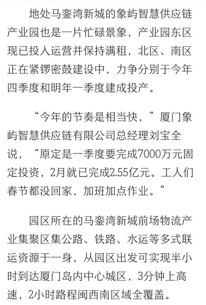 ‘公司在春節(jié)期間動員所有班組不停工,實際完成固定投資2.55億元。’廈門象嶼智慧供應鏈有限公司黨支部書記、總經理劉寶全介紹,當前,公司正進一步加快項目建設,全力沖刺首季‘開門紅’。”